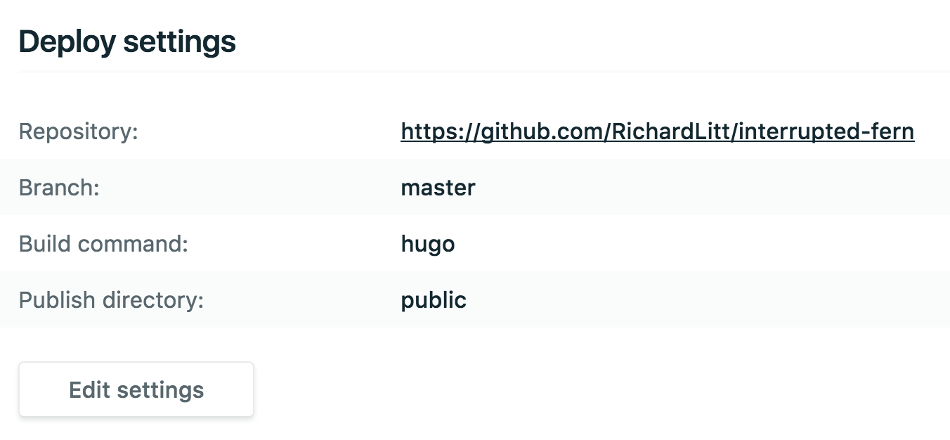 But, there are a few hitches. Without going into huge detail, here is the standard way of getting something up and running. Since I’ll be going through this, I’ll use a site I’ve been meaning to build - interruptedfern.com. I already have the domain pointed to Netlify, with these settings: